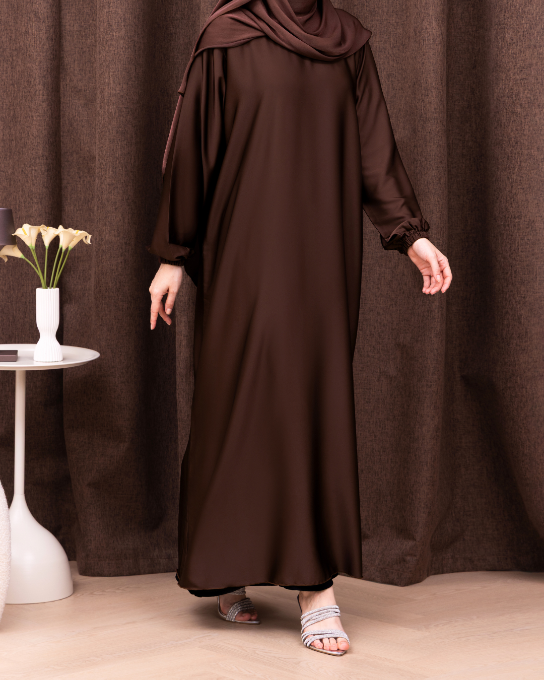 • Three-piece set: outer kaftan abaya, slip dress, and matching hijab