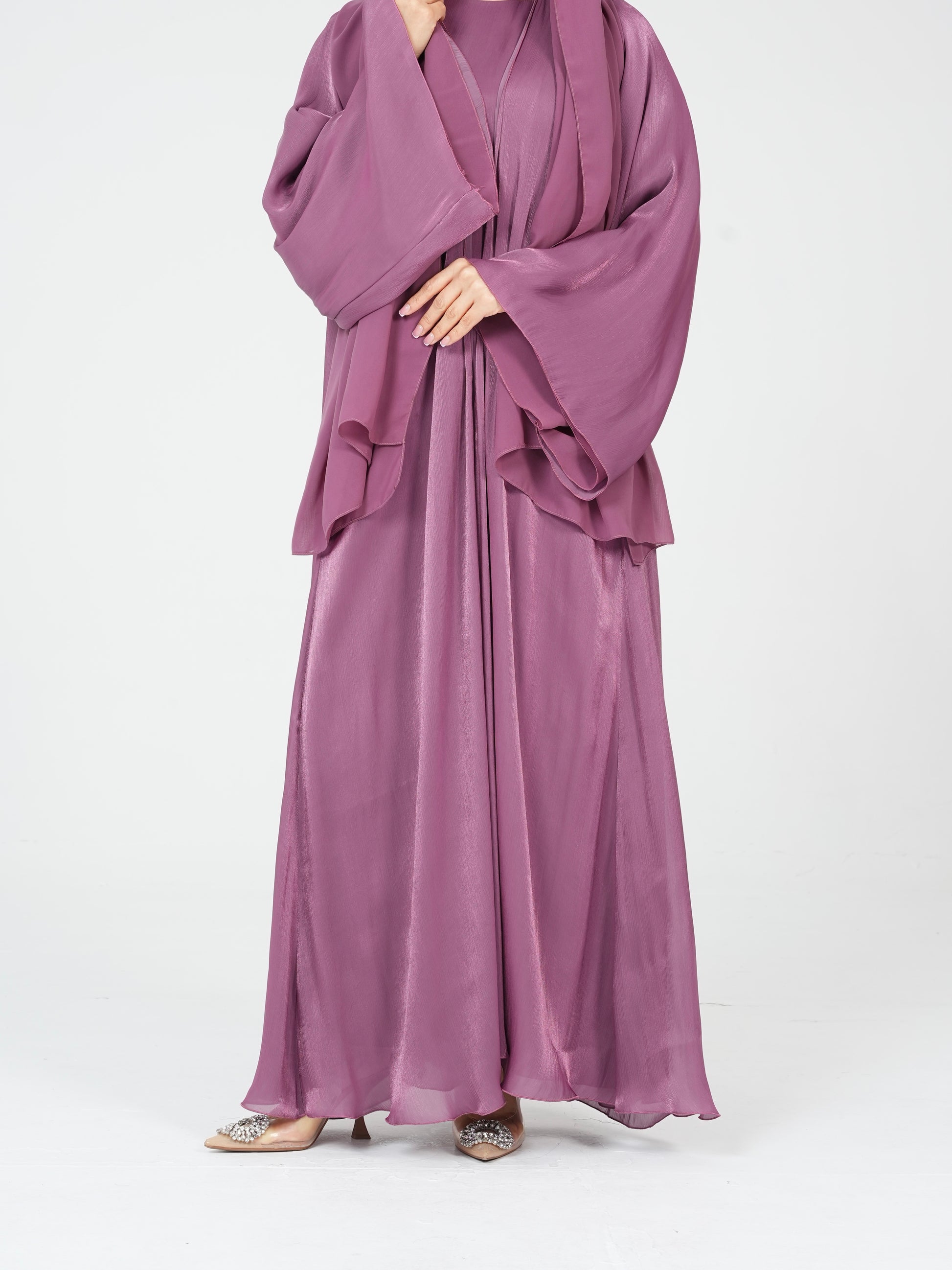 Crafted from our favourite lightweight fabric, this two-piece abaya set is designed for effortless elegance. It features a short-sleeved inner slip dress and a flowing open outer abaya with wide sleeves, all fully lined for maximum coverage. The soft purple/pink hue is the perfect colour for summer - fresh, breathable, and flattering. Finished with a matching chiffon hijab for a complete, coordinated look.