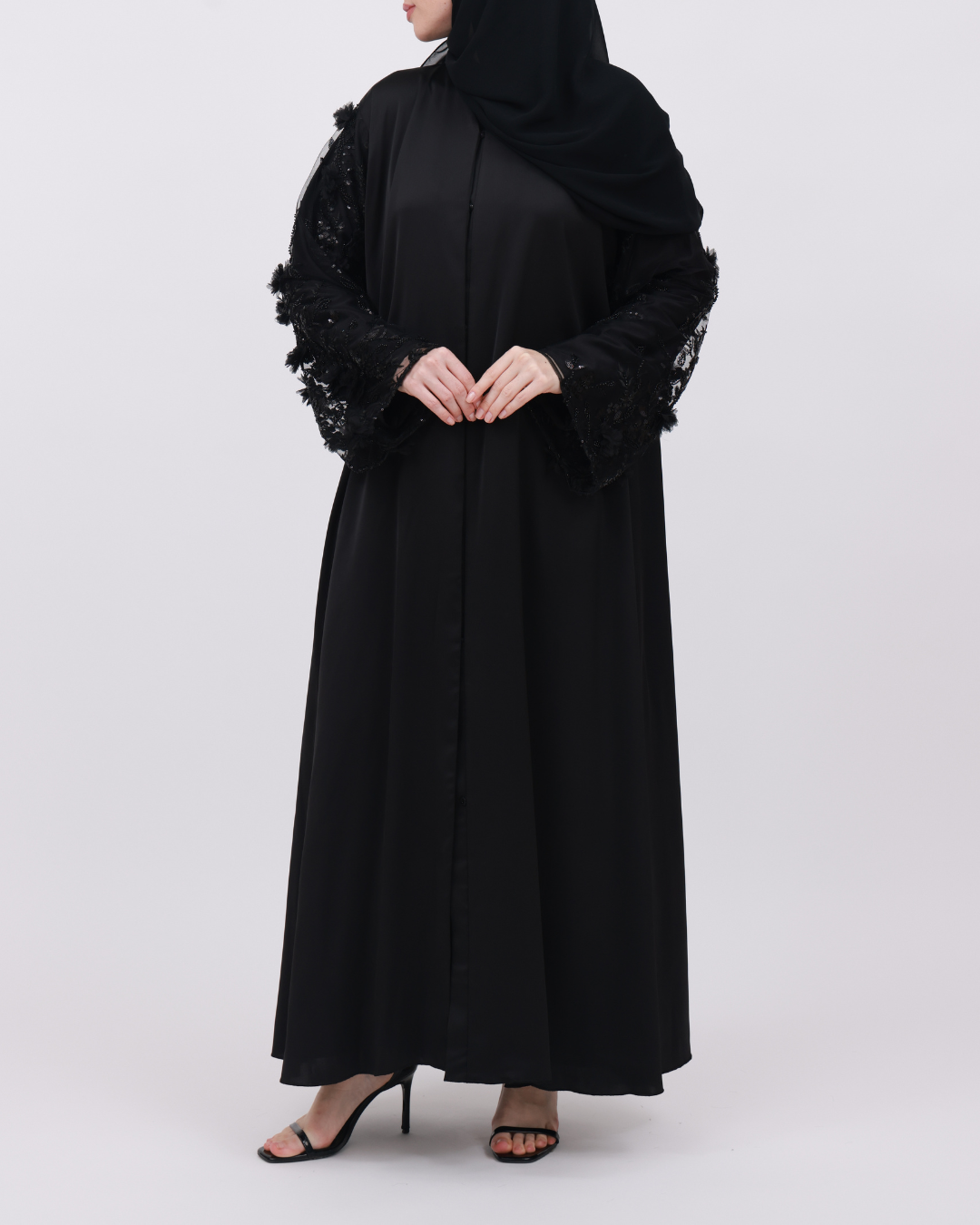Crafted from luxurious black satin, this abaya features statement lace net sleeves adorned with intricate floral embroidery and tonal black sequins. Delicate 3D embellishments add texture and depth, while the soft drape of the fabric creates a graceful, fluid silhouette.
