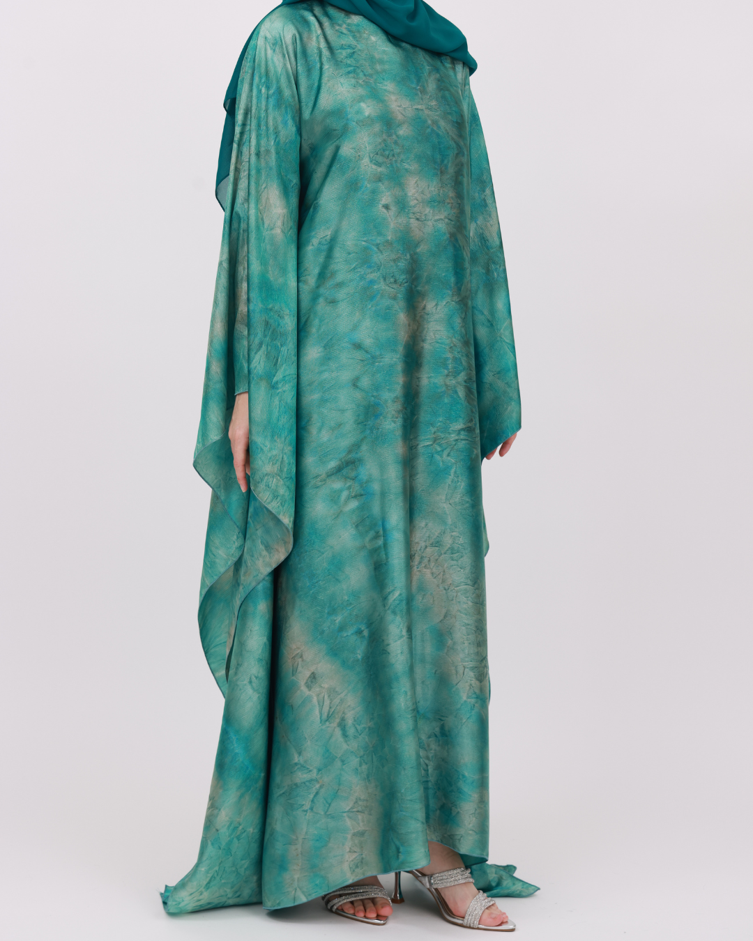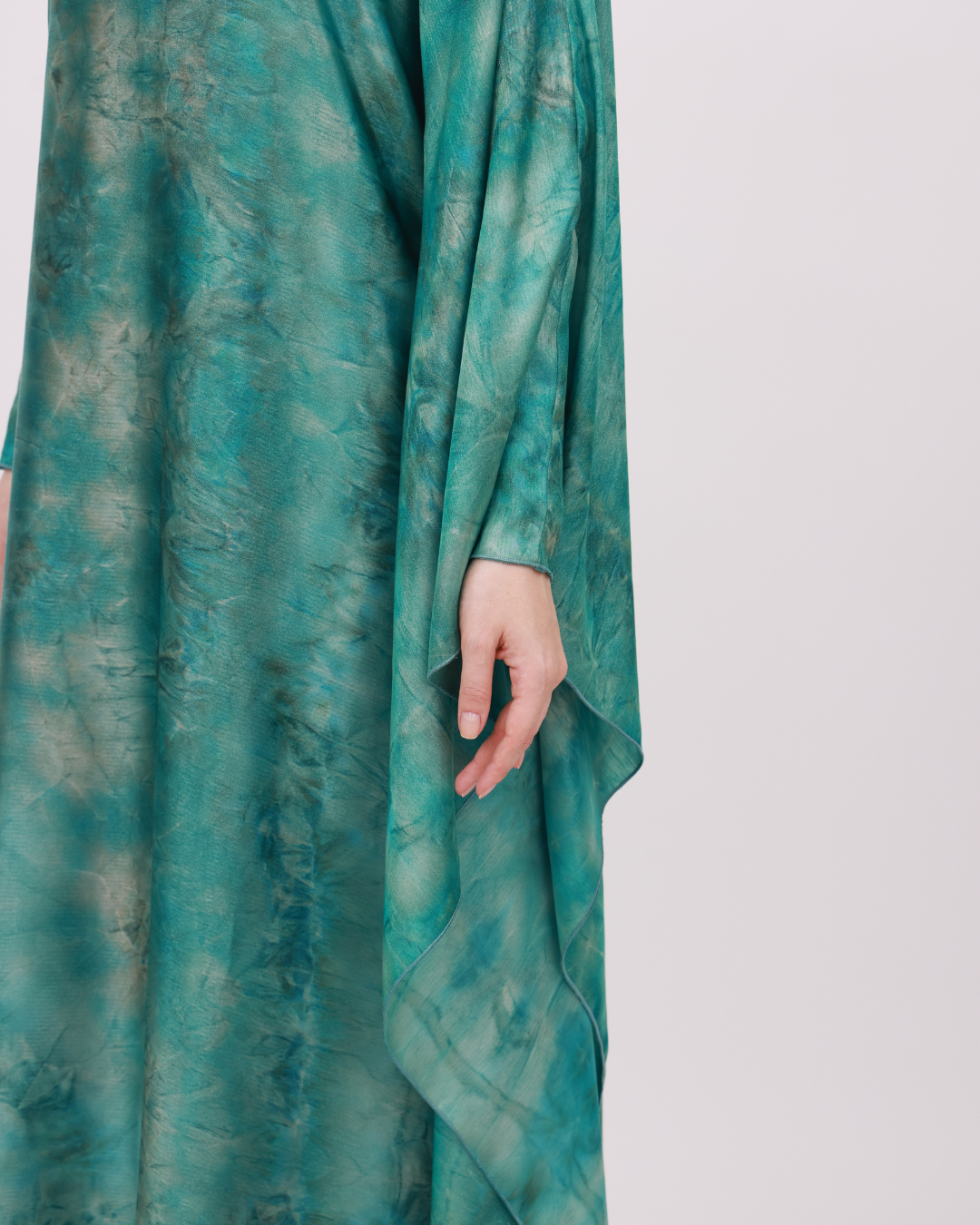 Thoughtfully finished with an open armhole design and subtle button closures, the sleeves can be secured for added coverage without losing the kaftan’s airy feel. A high collar with a discreet back zip provides a modest finish and gives the piece a sophisticated edge, making it a versatile choice for holiday evenings or special moments.